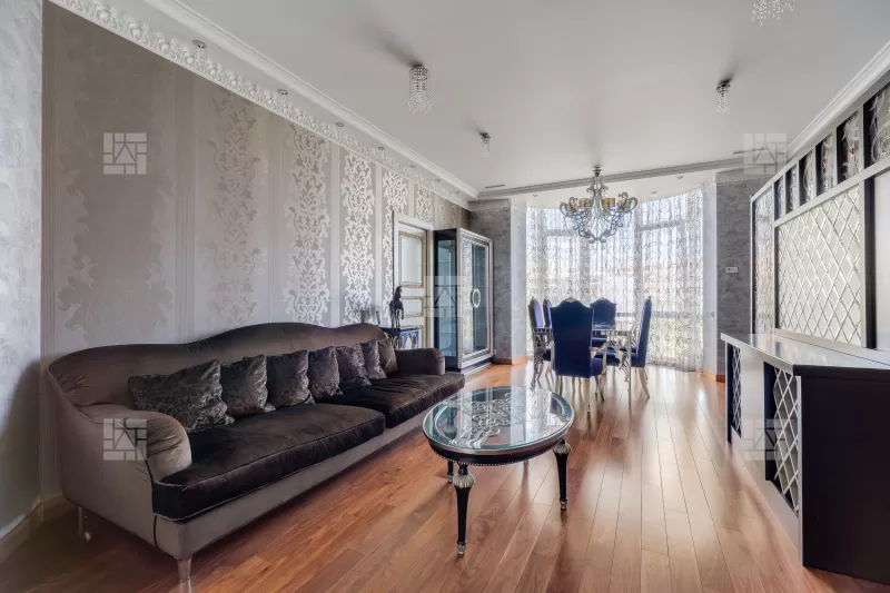 Вашему вниманию предлагается просторная квартира с дизайнерским ремонтом в жилом комплексе бизнес-класса "Дом на Таганке". Планировка: - просторная кухня-гостиная - 39,7 кв.м., - мастер-спальня - 30,7 кв.м. с гардеробной и большим с/у, с небольшим кабинетом и комнатой отдыха, - спальня - 26,5 кв.м. со своим с/у, - спальня - 13,1 кв.м., - спальня 9,3 кв.м., - гостевой с/у при входе. Выполнена отделка в классическом стиле, квартира меблирована и оснащена качественной бытовой техникой. Высота потолка 3,3 м. Окна выходят в тихий двор и на улицу с видом на сквер. Жилой комплекс бизнес-класса "Дом на Таганке" находится в историческом центре старой Москвы — в Таганском районе (ЦАО), рядом с площадью Абельмановской Заставы и Покровским монастырем. Удобный выезд на Таганскую улицу, позволяет быстро добраться до Садового Кольца и центра столицы. В пешей доступности находятся станции метро "Крестьянская застава", "Пролетарская", чуть дальше — "Площадь Ильича". Квартиры в ЖК "Дом на Таганке": ЖК "Дом на Таганке" рассчитан на 207 квартир площадью от 50 до 345 кв. м. Проектом предусмотрены свободные планировки, лоджии с панорамным остеклением, французские балконы. Кроме традиционных квартир в жилом фонде представлены видовые квартиры и 12 пентхаусов! Высокие потолки (3.3 метра) и панорамное остекление создают благоприятные условия для качественной инсоляции комнат. Описание и инфраструктура: ЖК "Дом на Таганке" построен строительной компанией Potok (правопреемница MIRAX GROUP) по индивидуальному проекту. Здание состоит из 4-х секций и имеет переменную этажность (14-16-18). Верхние этажи занимают одно- и двухуровневые пентхаусы с большими открытыми террасами. В помещениях первых этажей располагаются эксплуатационные службы и объекты инфраструктуры — ресторан, фитнес-зал, салон красоты, торговый центр. Дом оборудован современными инженерными системами — приточно-вытяжной вентиляцией, центральным кондиционированием, спутниковым и эфирным телевидением, телефонией, высокоскоростным интернетом. Бесшумные лифты Kone опускаются в подземный паркинг. Большая придомовая территория превращена в благоустроенную двухуровневую зону отдыха. Здесь представлены и ландшафтный сквер с мощеными аллеями, и детские площадки, и открытый солярий с летним бассейном и шезлонгами для отдыха в жаркий день.