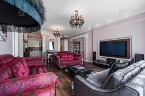 На стенах размещены тканевые обои, финишная итальянская краска , двери и проемы выполнены из натурального дерева, раздвижные стеклянные двери. На полу уложен натуральный камень, итальянский керамогранит и мрамор (с подогревом),а также паркетная доска.