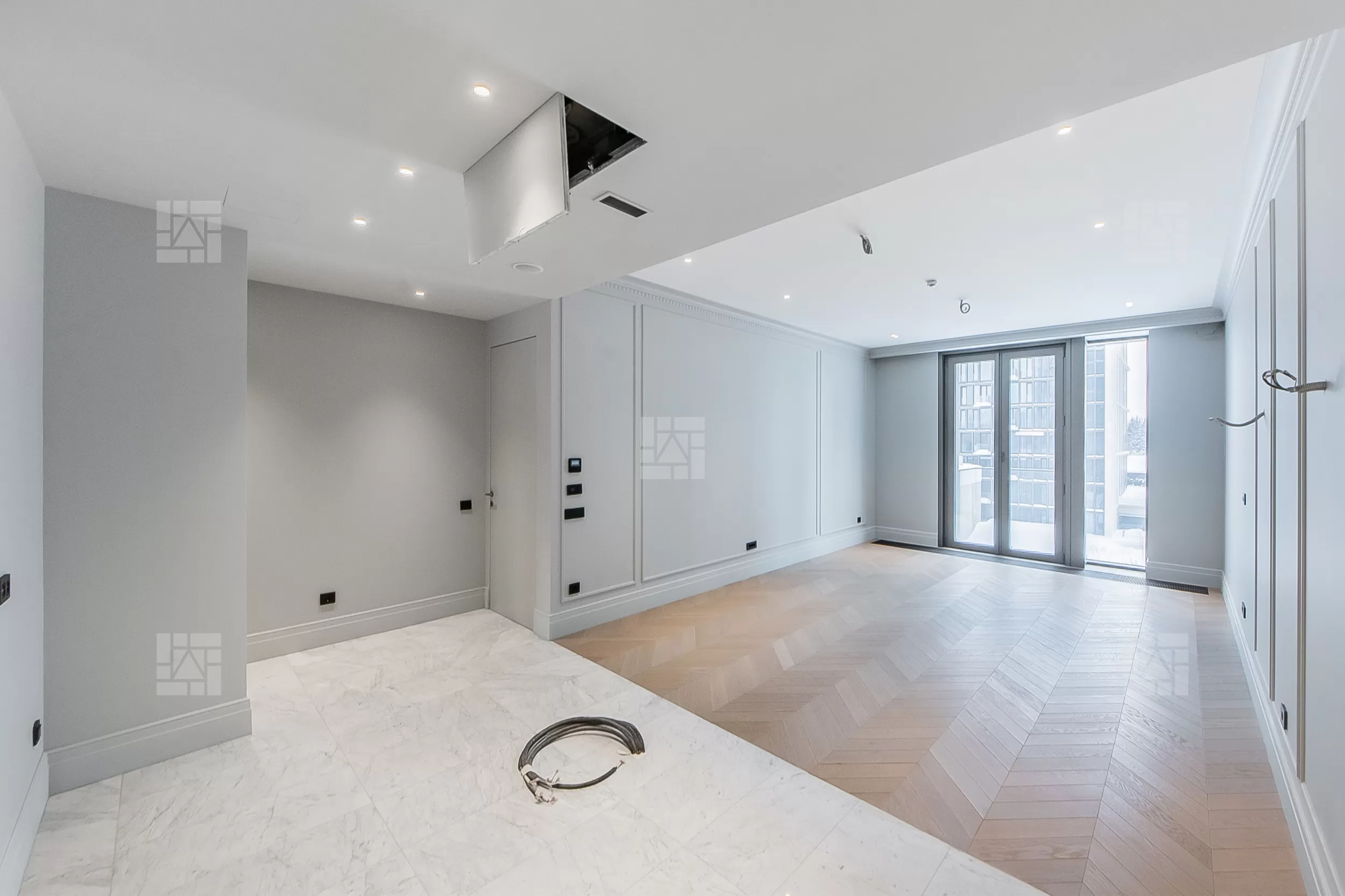 По планировке: кухня-гостиная, три спальни со своими ванными комнатами, постирочная, просторный холл. Ремонт выполнен в стиле неоклассика, высокие потолки 3.5 м, панорамные окна, виды на две стороны: во внутренний двор, Парк Победы и в сторону Генерала Дорохова.