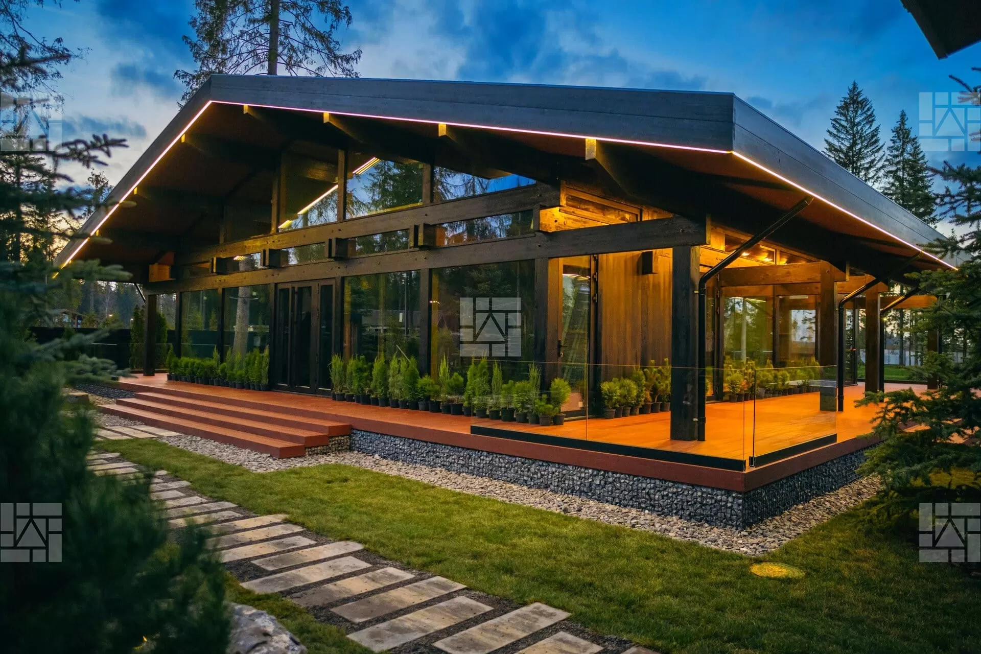 Архитектурное решение виллы — идеальный для России стиль фахверк. Дом построен по ригельно-стоечной технологии из клееного бруса большого сечения. Мощный деревянный каркас держит всю конструкцию и позволяет делать широкие пролёты с панорамным остеклением без потери прочности. 83% периметра виллы занимают двухкамерные стеклопакеты с мультифункциональным напылением. Кровля виллы выполнена из цементно-песчаной черепицы.