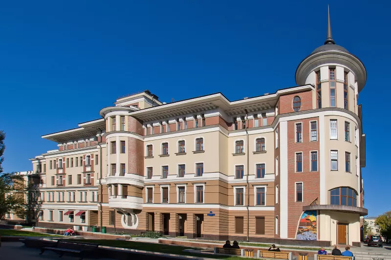 На момент строительства, здание считалось одним из крупнейших жилых домов в Европе. На 12 этажах располагалось 505 квартир, вход в которые осуществлялся через 24 подъезда. На лестничной площадке были устроены всего по 2 квартиры. В них изначально был настелен дубовый паркет, потолки были декорированы художественной росписью, которую выполнили живописцы-реставраторы из петербургского Эрмитажа. Кухни были оборудованы специальным отверстием для самоварной трубы.